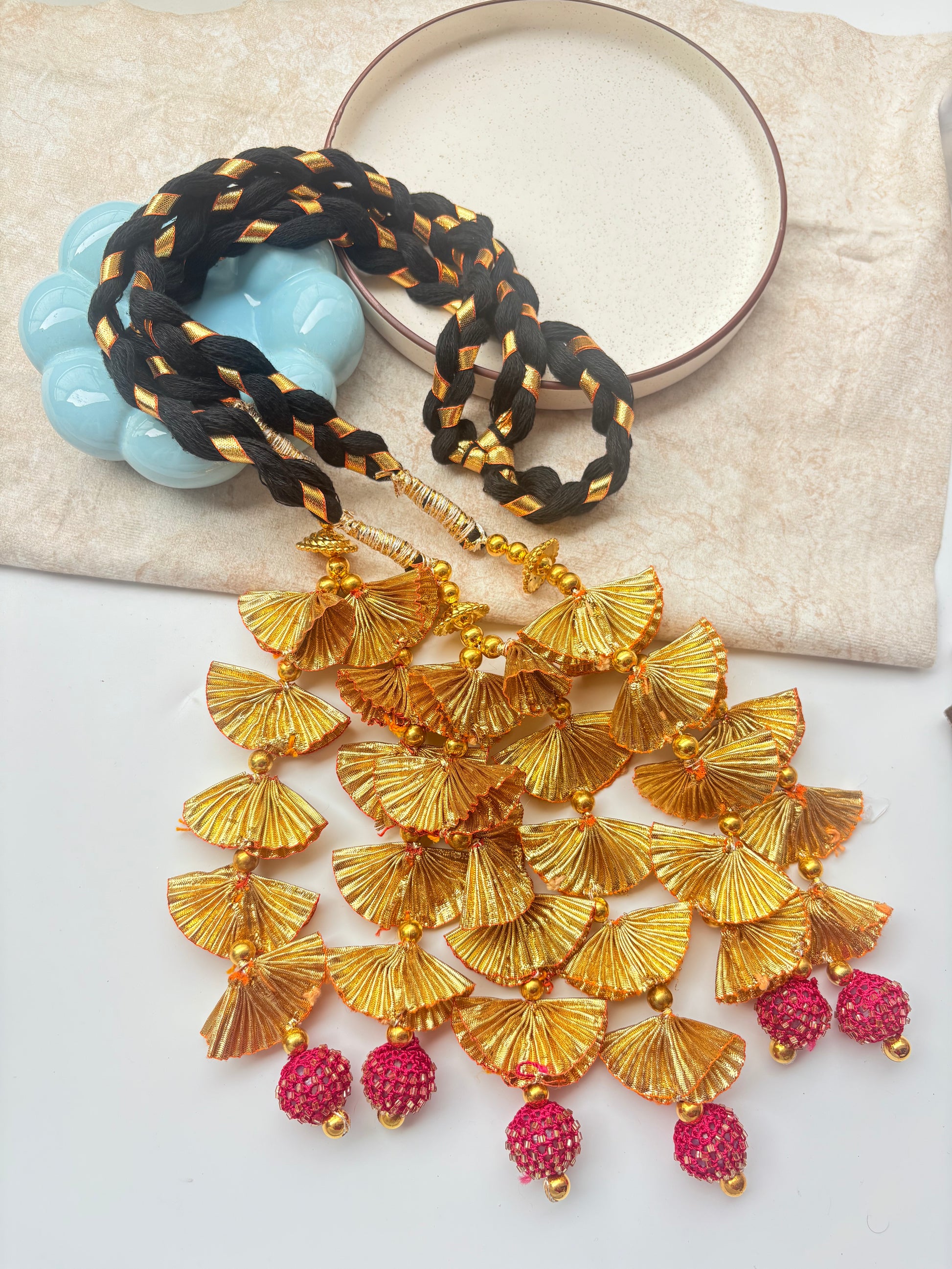Lightweight Handcrafted golden gota Paranda with fan tassels & colored beads. Perfect for bridal, festive & traditional looks.