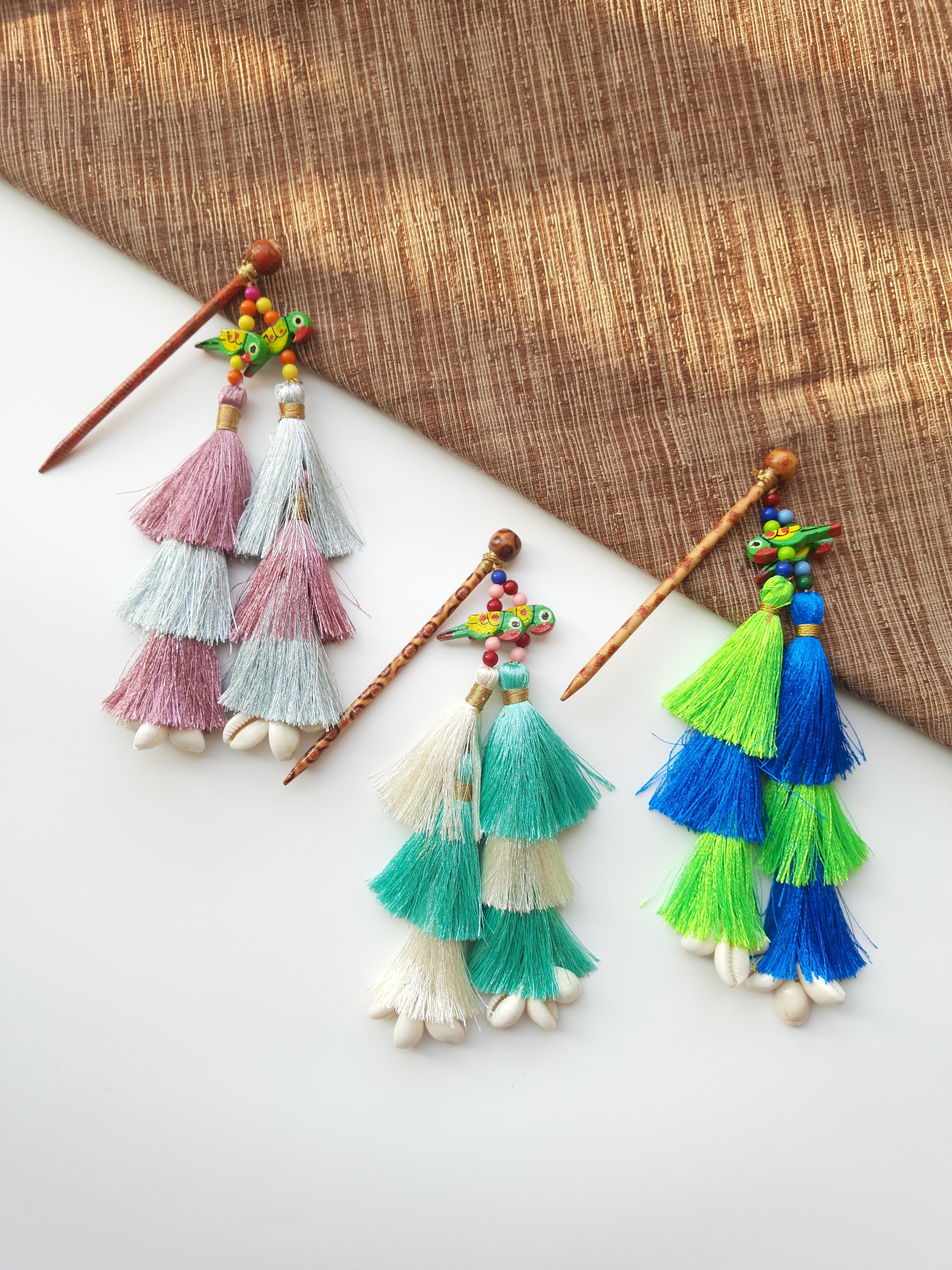 Give your hairstyles a vibrant, cultural twist with our Handmade Juda Bun Sticks featuring bright thread tassels, colorful beads, wooden parrots, and cowrie shells.