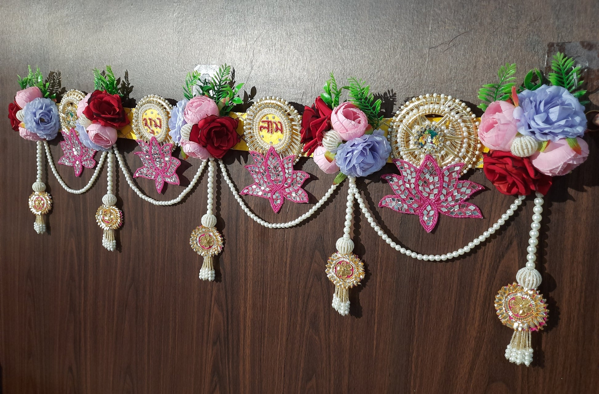 Designed with vibrant roses, lotus motifs, mirror work, and Subh-Labh symbols, this toran is perfect for adorning doors, mandirs, or living spaces.