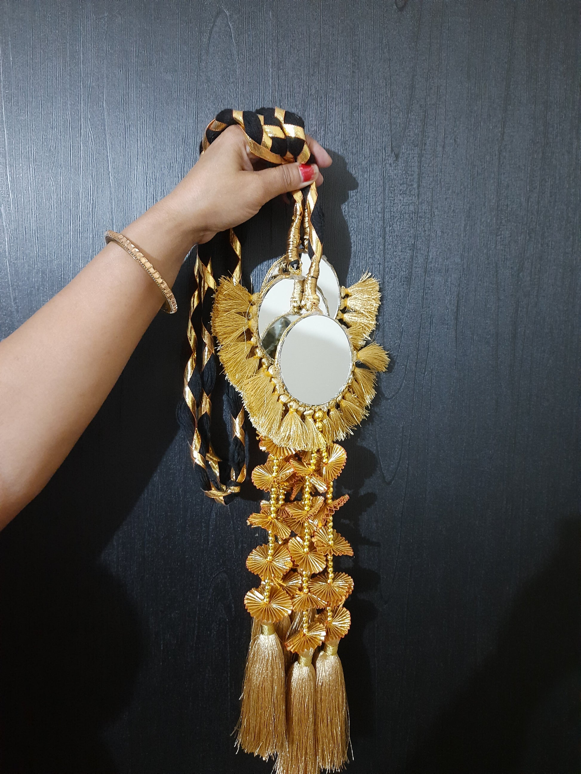 Make a bold statement with our Moon Paranda a luxurious golden and a heavy braid accessory with oversized mirrors, shiny tassels, and intricate fan motifs. Crafted on a black-golden choti , this handmade beauty is ideal for bridal hairstyles, mehendi functions, and festive glam looks.