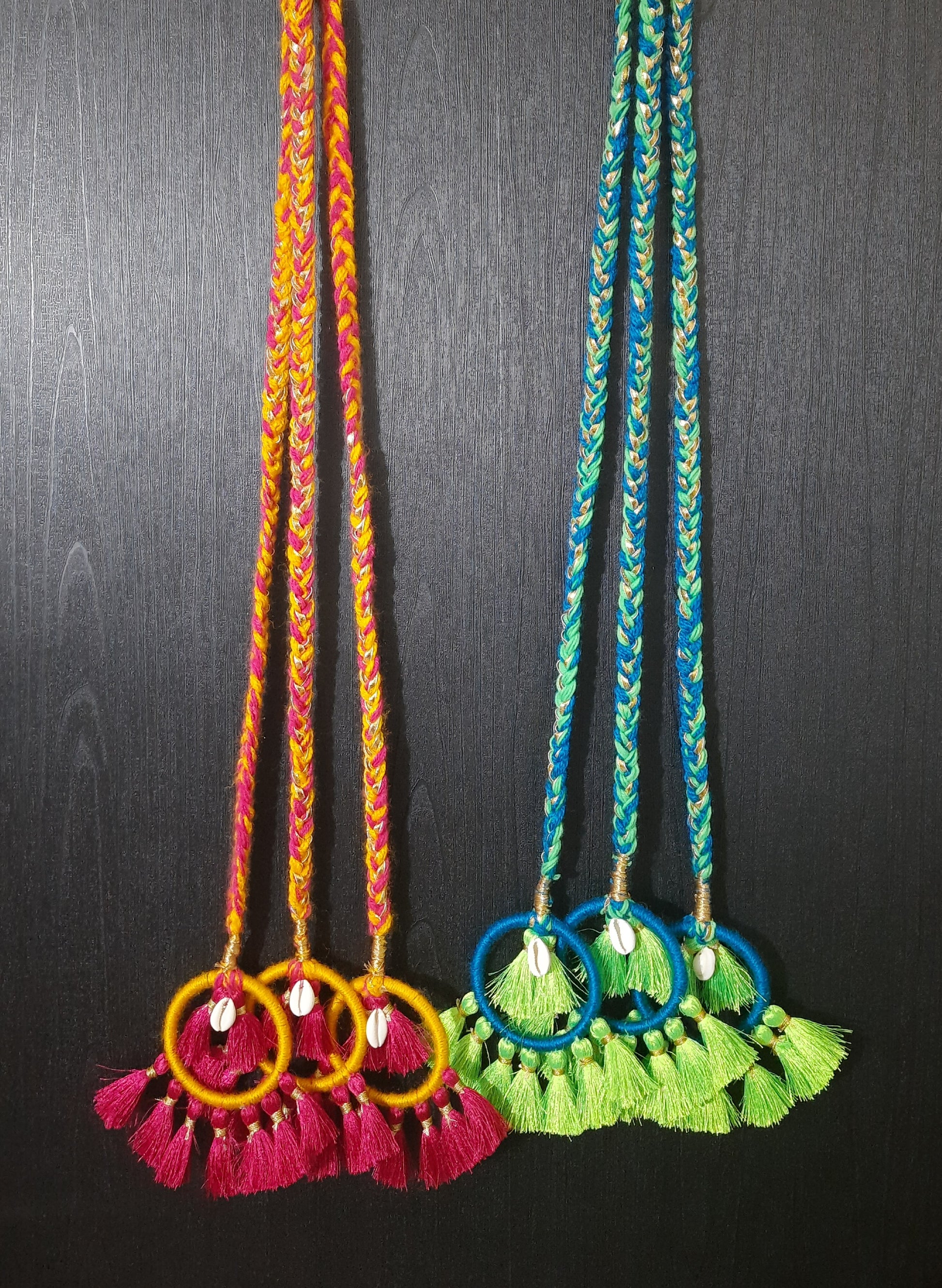 Vibrant, handcrafted woolen paranda with bold braided strands, round woolen hoops, kodi shells & tassels.