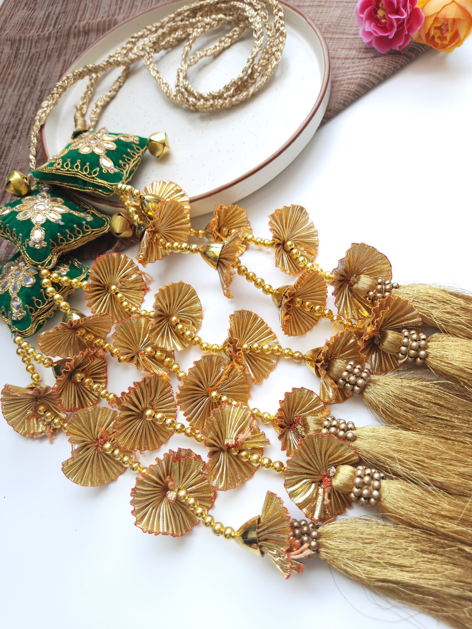 Add a royal flair to your ethnic look with our Sundari Cusion Paranda, a handcrafted beauty in rich emerald green and gold. This premium paranda features: