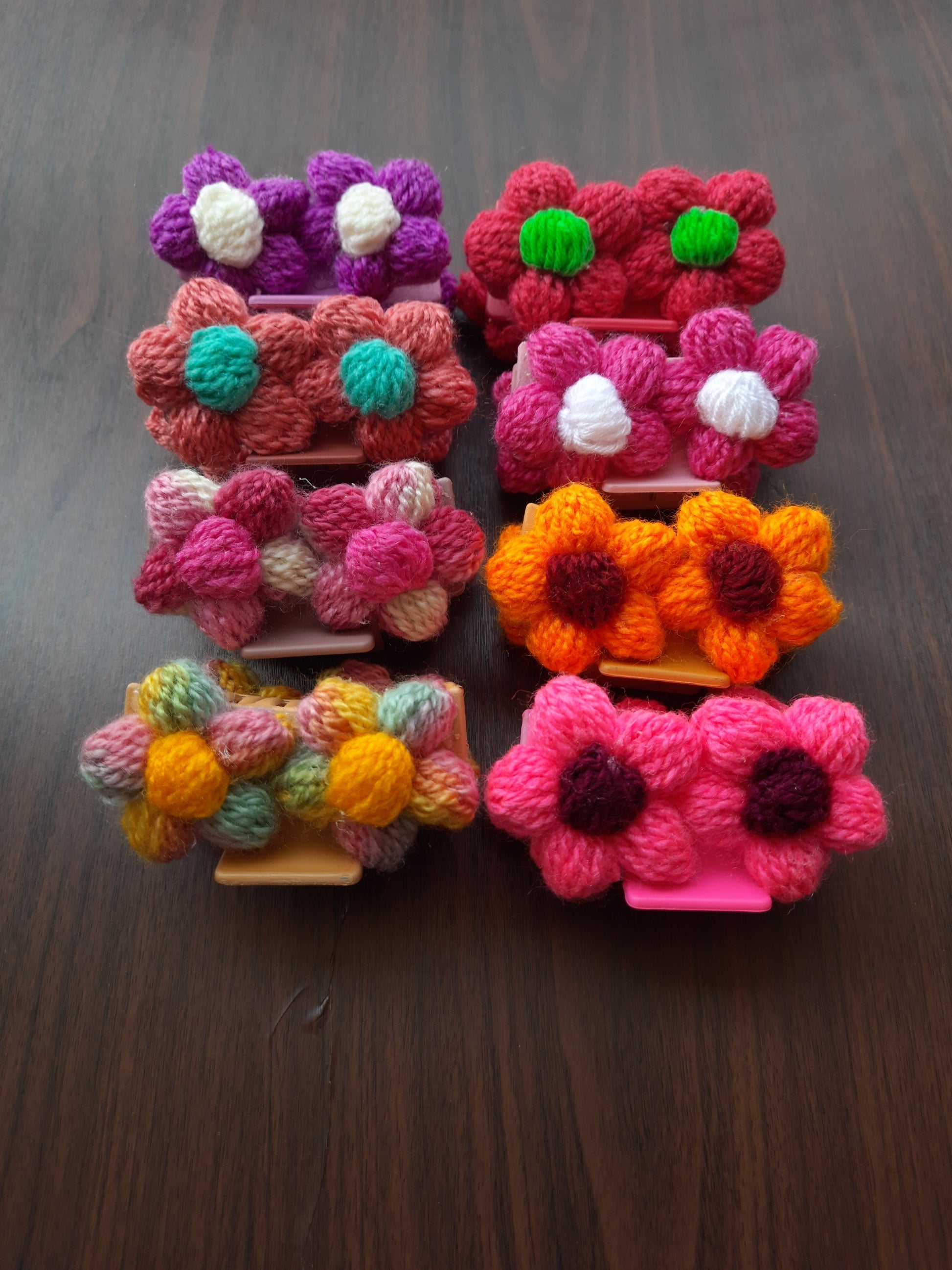Hand-crocheted with soft wool in vibrant colour combos, each clip features dual-flower detailing on sturdy pastel claws.